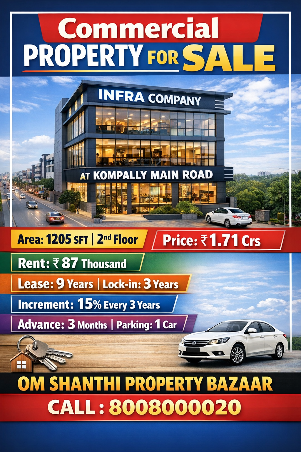 Sale of commercial property with INFRA COMPANY at Kompally main road, Area:1205 sft, 2nd floor, Price:1.71 crs, Rent:87 Thousand, Lease:9 years, Lock in period:3 years, Increment:15% every 3 years,Advance:3 months,Parking:1 car.